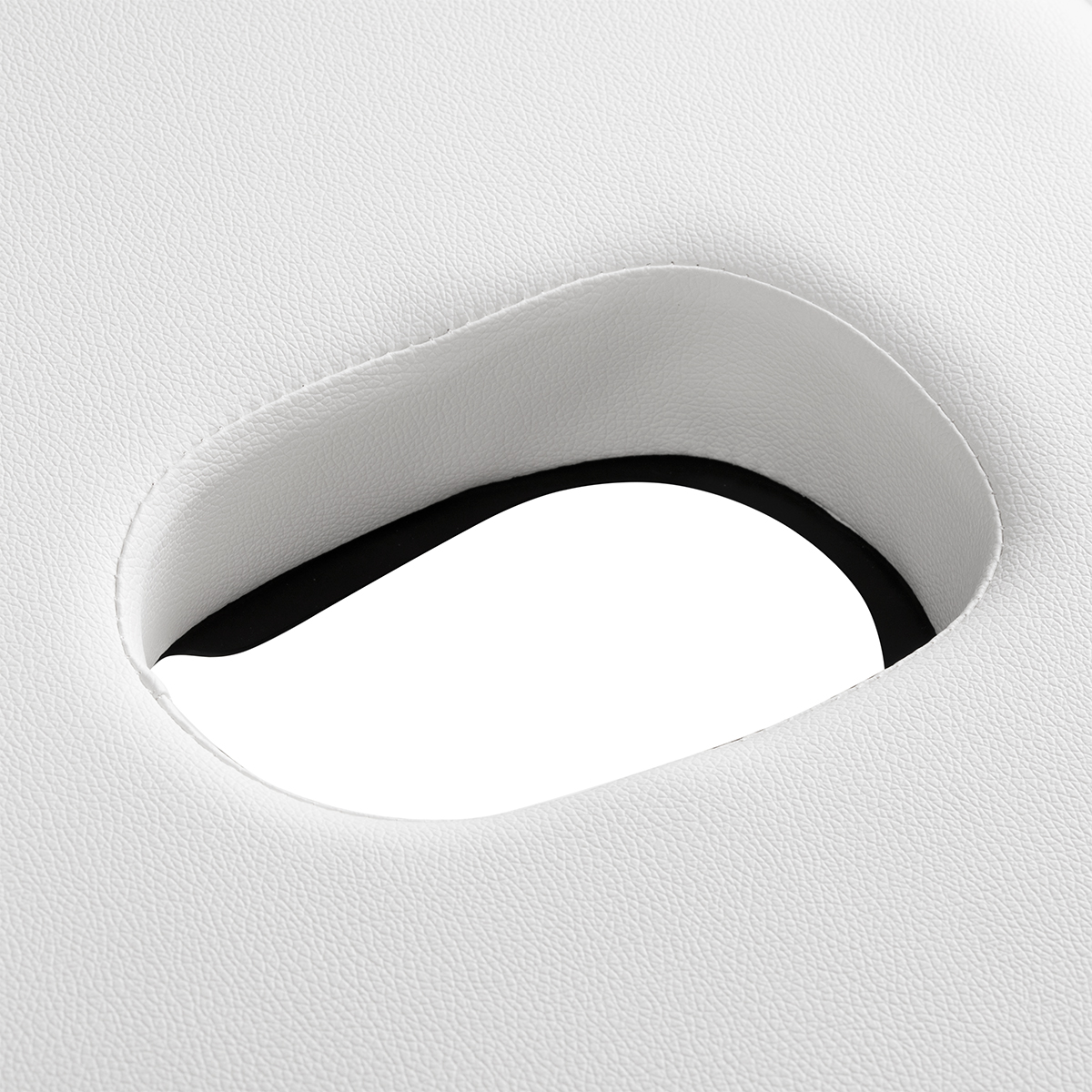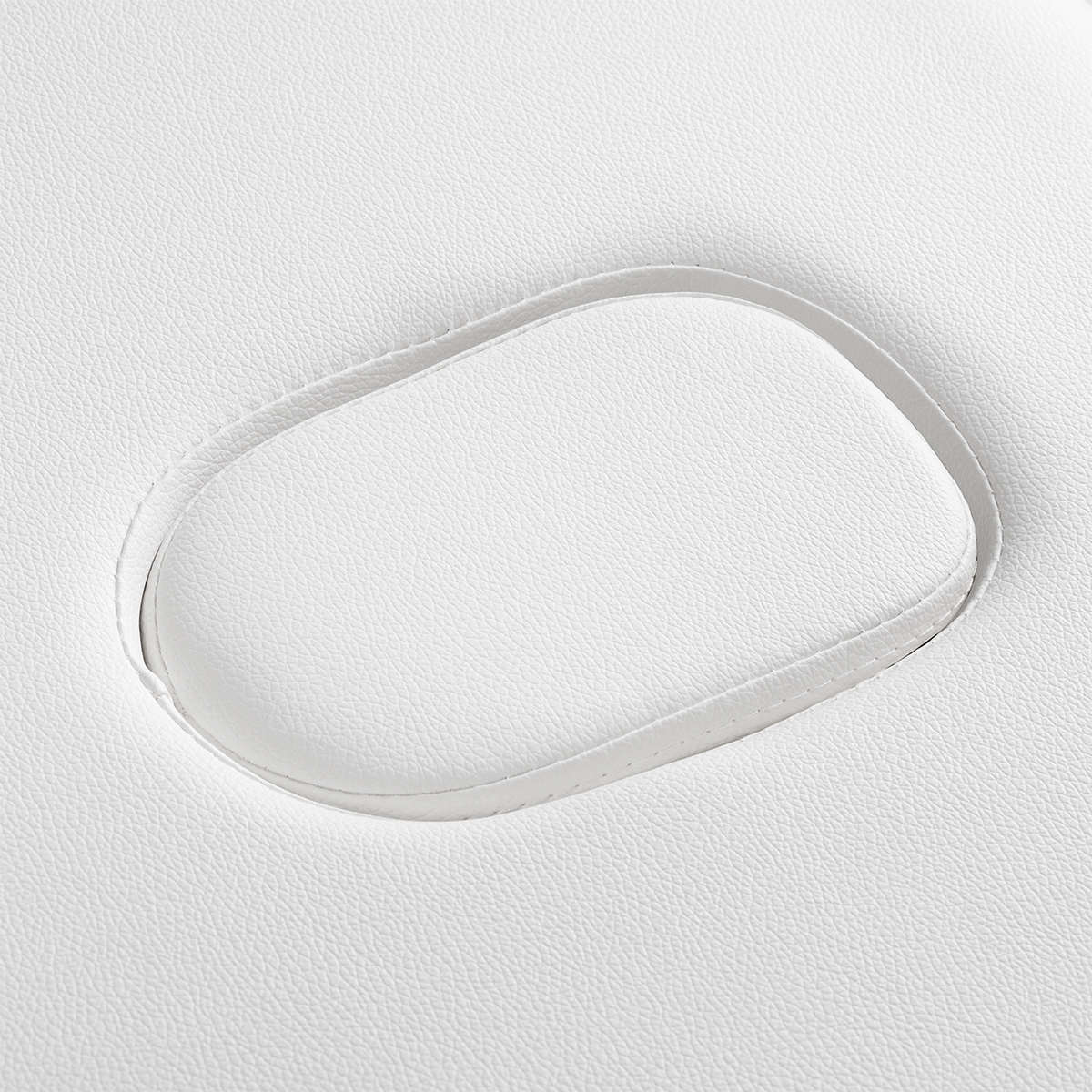 Die im Set enthaltene Kopfstütze mit integriertem Gesichtsausschnitt gewährleistet komfortable Positionierung bei Rücken-, Bauch- und Seitenlage. Sie fördert tiefe Entspannung auch bei längeren Behandlungen und sorgt für optimalen Kopfhalt. Die zweifach verstellbare Neigung ermöglicht präzise Anpassung an verschiedenste Behandlungstechniken und individuelle Kundenbedürfnisse.