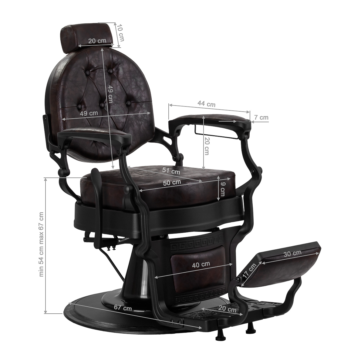 Die solide Konstruktion des Sockels sorgt für Stabilität und hohen Nutzungskomfort. Die Sitzfüllung aus strapazierfähigem, verformungsbeständigem Schaumstoff und die Polsterung aus angenehm haptisch anmutendem Kunstleder mit seidenmattem Finish sorgen für die Langlebigkeit der Möbel und ihre komfortable Nutzung über einen langen Zeitraum. Außerdem machen sie die Geräte feuchtigkeitsbeständig, langlebig und leicht zu reinigen. Der Bezug in Brauntönen mit Steppung und Zierknöpfen verleiht ihm einen einzigartigen Charakter. Der Sessel mit seinem charakteristischen Design, das sich auf den Vintage-Stil bezieht, fügt sich perfekt in die Atmosphäre von Friseursalons ein und unterstreicht deren einzigartige Atmosphäre.