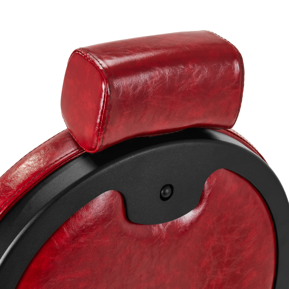 Die solide Konstruktion des Sockels sorgt für Stabilität und hohen Nutzungskomfort. Die Sitzfüllung aus strapazierfähigem, verformungsbeständigem Schaumstoff und die Polsterung aus angenehm haptisch anmutendem Kunstleder mit glänzender Oberfläche sorgen für die Langlebigkeit der Möbel und ihre komfortable Nutzung über einen langen Zeitraum. Außerdem machen sie die Geräte feuchtigkeitsbeständig, langlebig und leicht zu reinigen. Der Bezug in Rottönen mit Steppung und Zierknöpfen verleiht ihm einen einzigartigen Charakter. Der Sessel mit seinem charakteristischen Design, das sich auf den Vintage-Stil bezieht, fügt sich perfekt in die Atmosphäre von Friseursalons ein und unterstreicht deren einzigartige Atmosphäre.