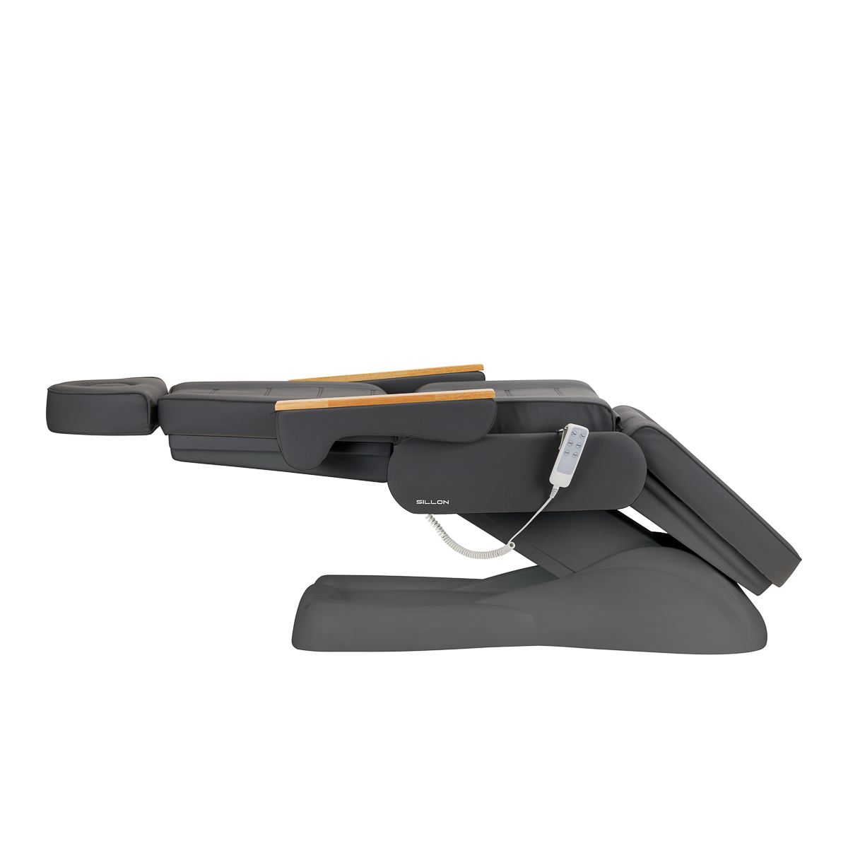 Die Sitzhöhe lässt sich im Bereich von 65 cm bis 82 cm regulieren. Im vollständig ausgeklappten Zustand erreicht der Sessel eine Länge von über 2 Metern – ideal für Ganzkörperbehandlungen. Diese Ausmaße ermöglichen eine optimale Anpassung an unterschiedliche Körpergrößen und gewährleisten Ergonomie für Therapeut und Klient gleichermaßen. Ein praktischer Metallgriff auf der rechten Armlehne dient zur Aufbewahrung der Fernbedienung und hält diese jederzeit griffbereit.