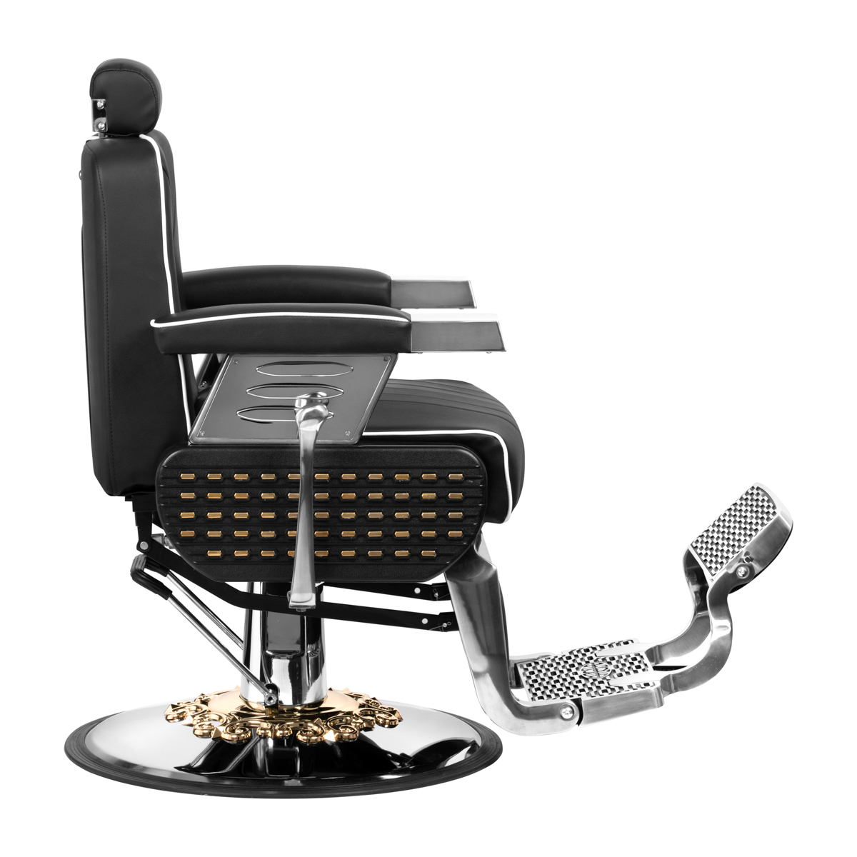 Der stabile Sockel sorgt für sicheren Stand. Formbeständiger Schaumstoff und halbmattes Kunstleder garantieren Langlebigkeit und Komfort. Die schwarze Polsterung in Kombination mit verchromten Metallelementen und dekorativer Fußstütze verleiht dem Stuhl einen klassischen Vintage-Charakter, ideal für professionelle Barbersalons.