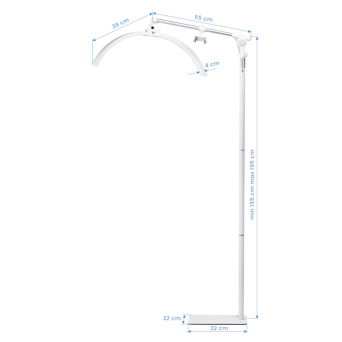 Das robuste Stativ lässt sich stufenlos zwischen 155-193 cm verstellen und passt sich somit jeder Arbeitsstation an – egal ob Kosmetikliege, -stuhl oder Behandlungstisch. Die präzise Höheneinstellung mit Feststellschraube ermöglicht optimale Lichteinfallswinkel für jeden Anwendungsfall. Zwei Fernbedienungen – eine direkt an der Lampe, eine kabellos – steuern die Einstellungen komfortabel. Der integrierte Magnet sorgt für sichere, mühelose Befestigung an der optimalen Position.