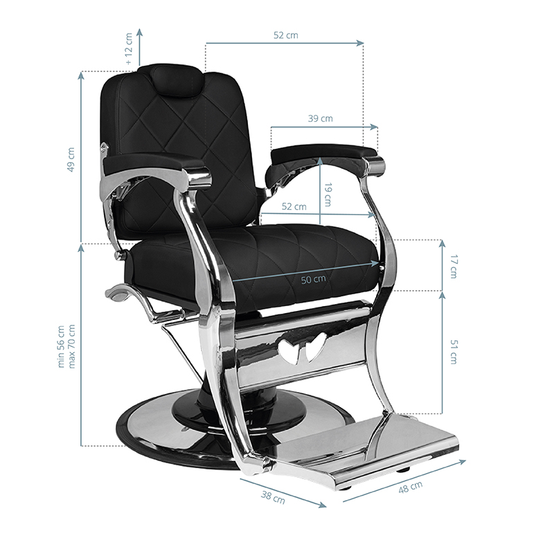 Neuheit in unserem Angebot - Barberstuhl IMPERIAL. Dies ist ein modernes, perfekt gefertigtes Möbelstück, das für maximalen Komfort Ihrer Kunden bei der Behandlung sorgt. Neben der Höhenverstellung verfügt der Stuhl über eine einstellbare Rückenlehne und eine verstellbare Fußstütze. Trotz seines geringen Platzbedarfs ist es möglich, den Kunden in eine bequeme, halbliegende Position zu bringen. Der bequeme Sitz ist mit hochwertigem Kunstleder bezogen. Ein breites, verchromtes Gestell sorgt für die Stabilität des Stuhls bei der Behandlung. Ein weiterer Vorteil ist die Möglichkeit, die Kopfstütze einfach zu verstellen. Der Stuhl ist in Schwarz erhältlich. Maximale Höhe: 72 cmMinimale Höhe: 60 cm Sitzbreite: 55 cm Sitzbreite mit Armlehnen: 74cmLänge der Fußstütze (verchromtes Element): 50 cm Verpackungsabmessungen:81 x 74 x 82 cm