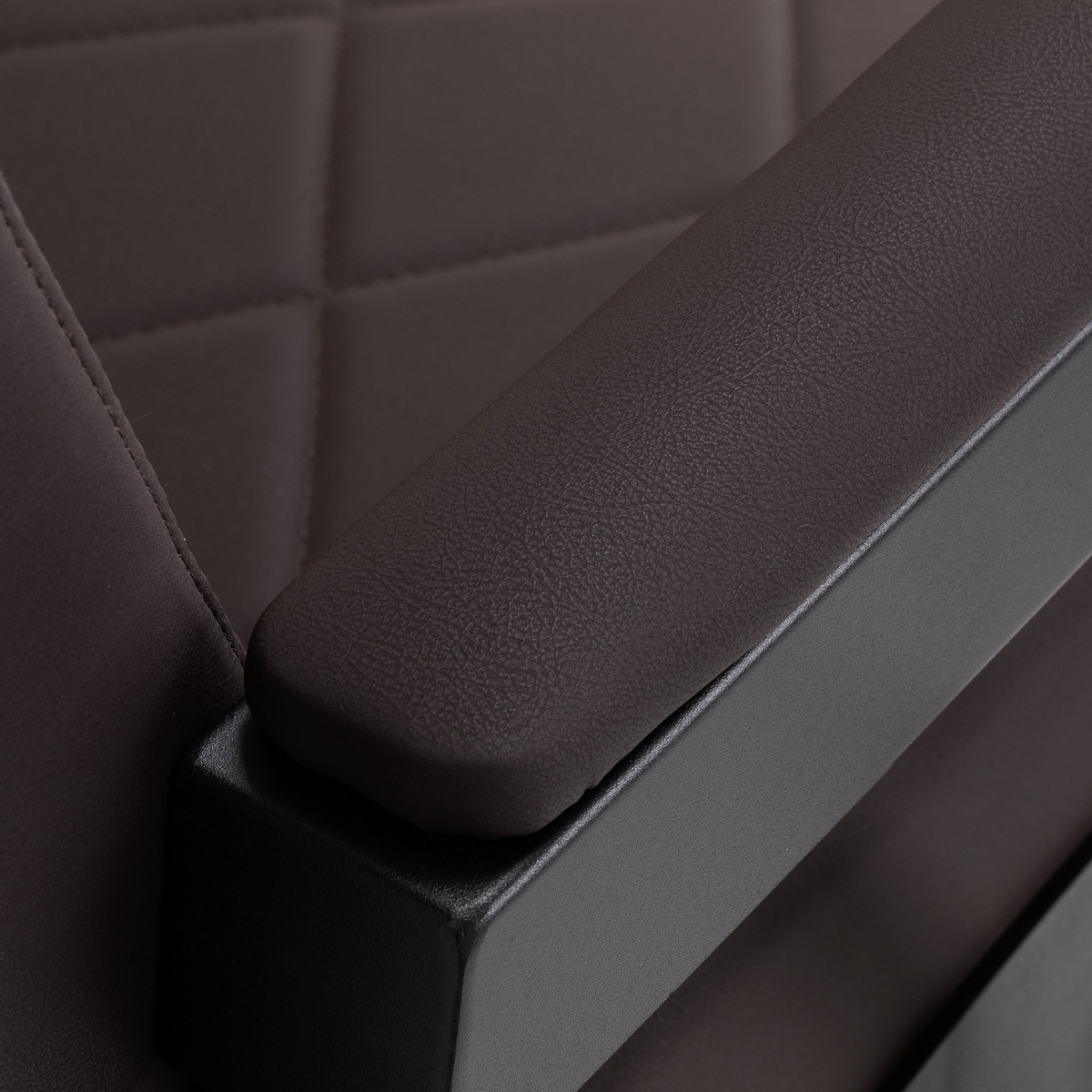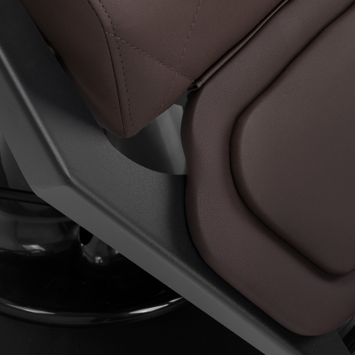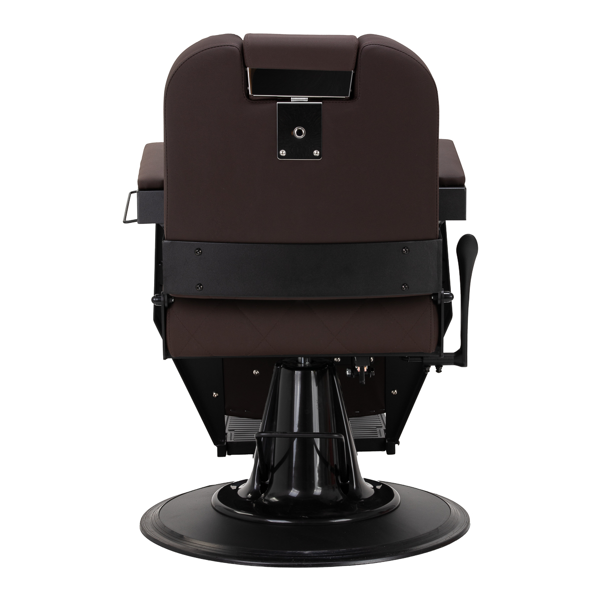 Die stabile Struktur sorgt für Sicherheit und lange Lebensdauer der Möbel. Die Sitzfläche ist mit verformungsbeständigem Schaumstoff gefüllt und eine Polsterung aus weichem Kunstleder verleiht den Möbeln Langlebigkeit und Komfort. Die feuchtigkeitsbeständigen Materialien sind nicht nur langlebig, sondern auch leicht zu reinigen. Die braunfarbene Polsterung in Kombination mit dem schwarzen Gestell verleiht dem Stuhl ein modernes und professionelles Aussehen, und der minimalistische Stil ermöglicht es ihm, sich in die Einrichtung jedes Friseursalons einzufügen.