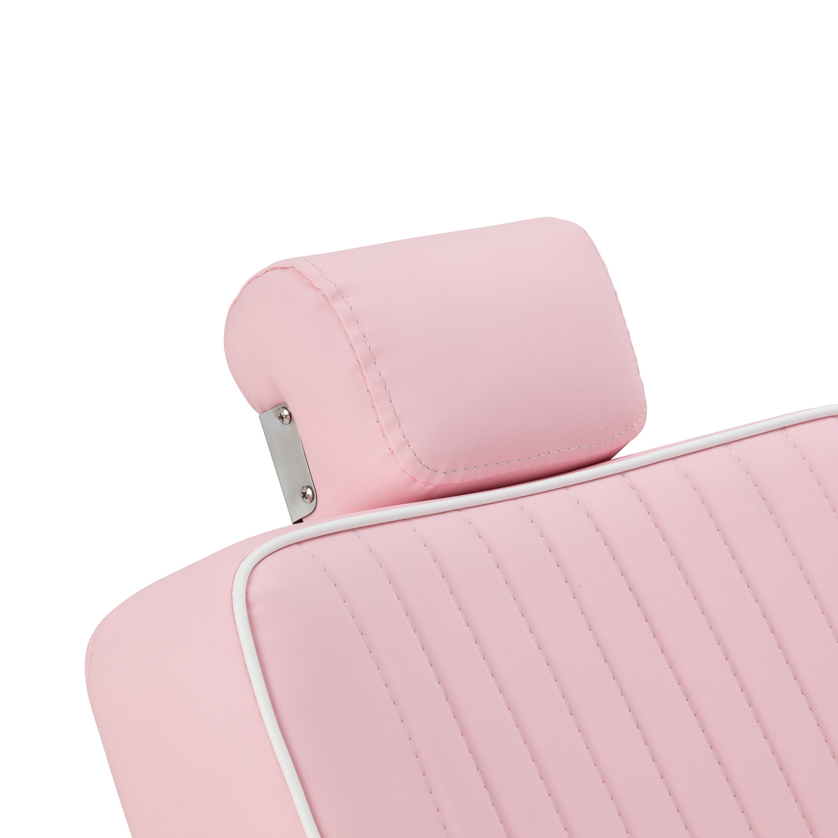 Die solide Konstruktion des Sockels sorgt für Stabilität und hohen Nutzungskomfort. Der Sitz ist mit verformungsbeständigem Schaumstoff gefüllt und mit weichem, mattem Kunstleder bezogen, das Langlebigkeit mit Komfort verbindet. Die für die Verarbeitung verwendeten Materialien sind feuchtigkeitsbeständig, langlebig und leicht zu reinigen, was den Sessel perfekt für die tägliche Arbeit macht. Stilvolle Nähte und Polsterungen in Rosatönen verleihen ihm einen einzigartigen Charakter, der perfekt zum Dekor moderner Friseursalons passt.