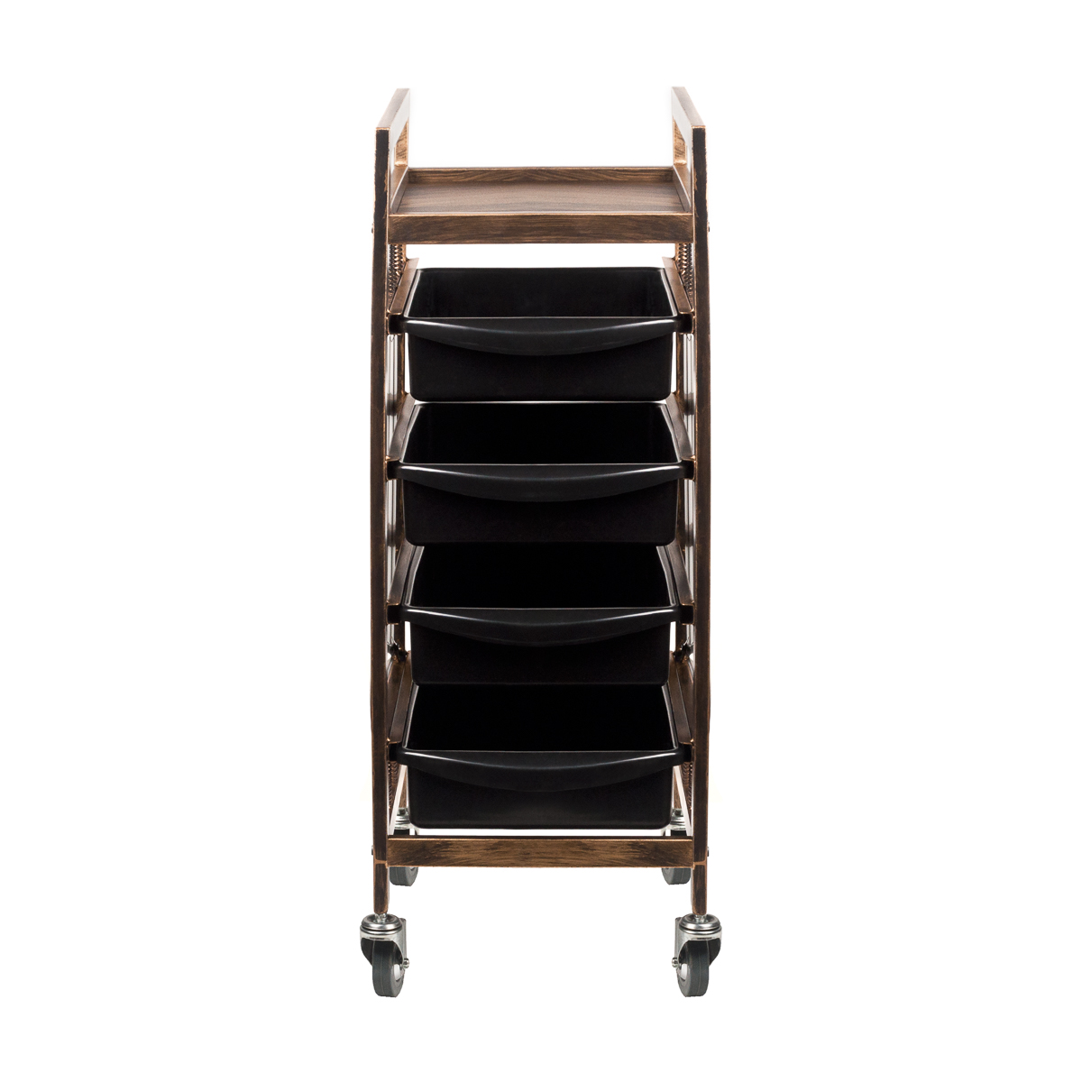 Dank gummierten Rollen gleitet dieser Friseurbedarf-Wagen mühelos über jeden Salonboden – Ihre wichtigsten Werkzeuge und Produkte sind damit immer und überall sofort griffbereit. Die hochwertig lackierten Goldelemente verleihen Ihrem Salon ein edles, zeitloses Aussehen und unterstreichen Ihre professionelle Arbeitsweise.