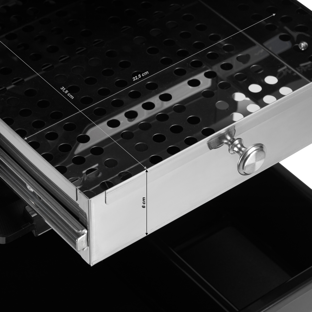 Der großzügig dimensionierte Organizer bietet maximale Flexibilität durch sechs verschiedene Schubladensysteme: zwei Behälter ohne Unterteilung, zwei mit praktischen Fächern und zwei tiefe, schmale Küvetten. Ihre individuelle Anordnung ist völlig flexibel – passen Sie das System an Ihre persönlichen Anforderungen an. Die beiden tieferen Behälter lassen sich seitlich in verschiedenen Höhen positionieren, sodass alle Instrumente optimal erreichbar sind. Die rutschfeste Rückwand schützt Ihre wertvollen Werkzeuge vor versehentlichem Verrutschen und damit vor Beschädigungen.
