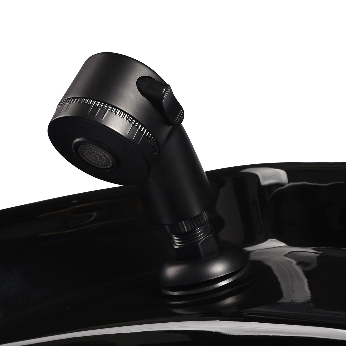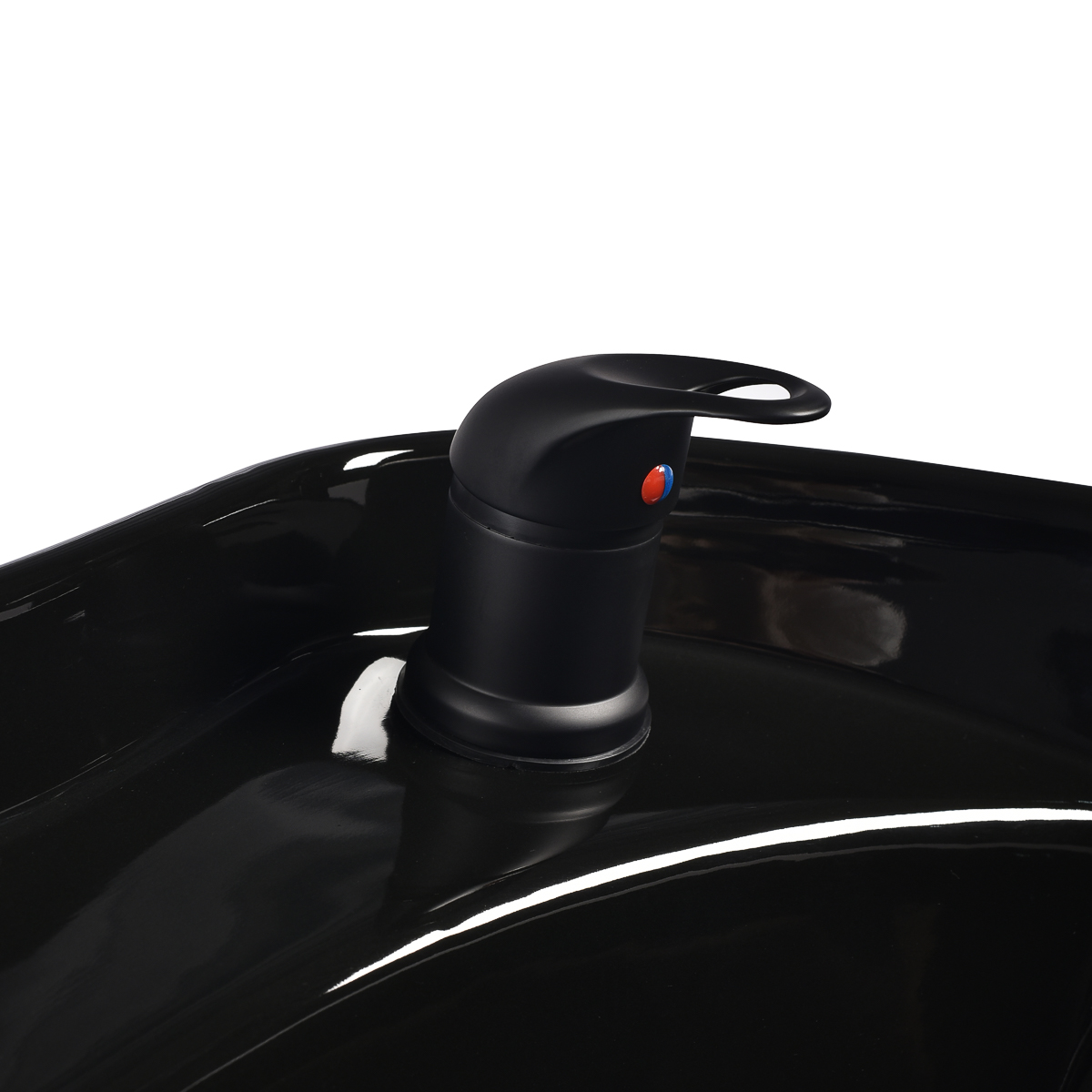 Die hochwertige Keramikschale in eleganten Schwarztönen bietet optimale Tiefe und ergonomische Form, die Wasserspritzer und Produktverlauf während der Behandlung wirksam minimiert. Der anatomisch geformte Nackenbereich mit geneigter Rückenlehne unterstützt den Kopf perfekt beim Waschen und sorgt für maximale Entspannung des Kunden. Die hochwertige Kunststoffkappe schützt vor der Kälte der Keramik und garantiert ein angenehmes, warmes Gefühl während jeder Haarwäsche.