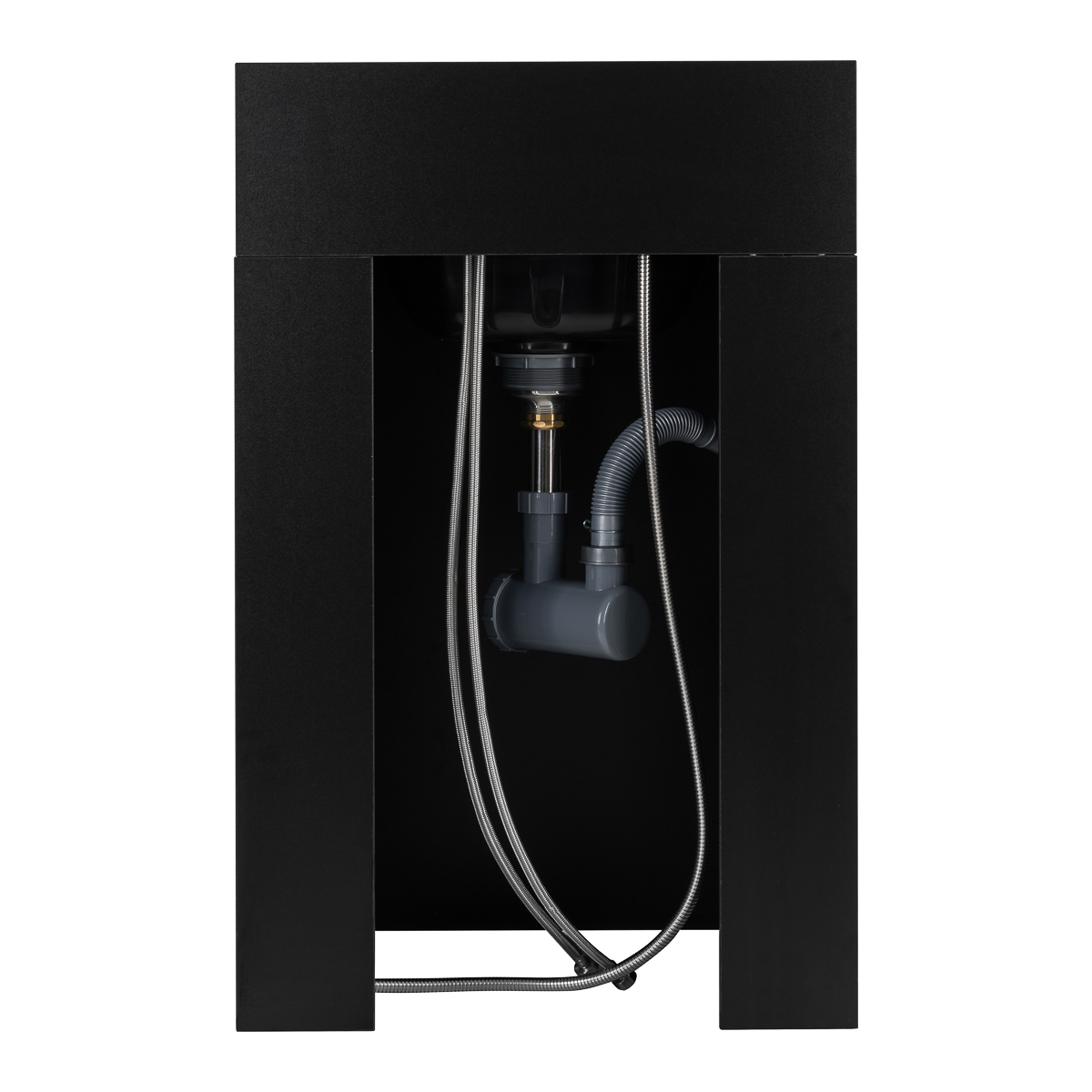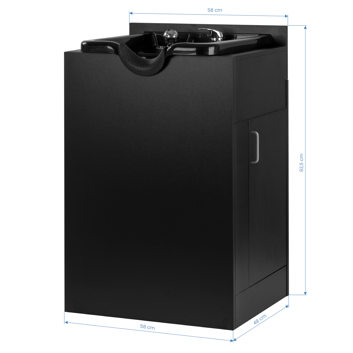 Die Waschtischanlage verfügt über praktische Seitentüren, die einfache Wartung und versteckte Lagerung von Haarpflegeprodukten ermöglichen. Das rückseitige Wasseranschluss-System gewährleistet sichere und ästhetisch unauffällige Installation – Rohre und Ablauf bleiben verborgen und sorgen für gepflegtes, professionelles Erscheinungsbild der Salonstation. Die kompakte Möbelbauweise passt perfekt in beide großzügige Salons und kleinere Frisöre – flexible Raumlösung für jeden Betrieb.