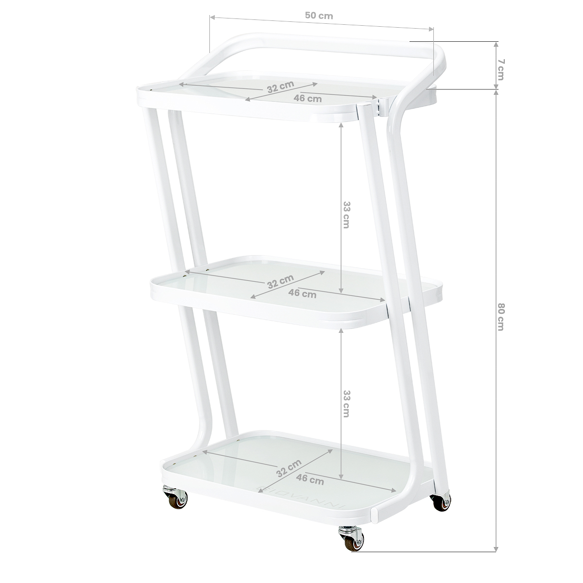 Der Giovanni H6701 Servierwagen ist das ideale Salonmöbel für Friseursalons, Kosmetikstudios und Wellnessbereiche. Dank seines leichten und dennoch robusten Aufbaus kombiniert dieser Arbeitstisch Mobilität mit zuverlässiger Stabilität – perfekt für effiziente Arbeitsabläufe. Die drei praktischen Glasablagen bieten ausreichend Platz zur organisierten Lagerung von Kosmetikprodukten, Styling-Utensilien und Behandlungszubehör. Das puristische Design verleiht jedem Saloninterieur eine professionelle und moderne Ausstrahlung.