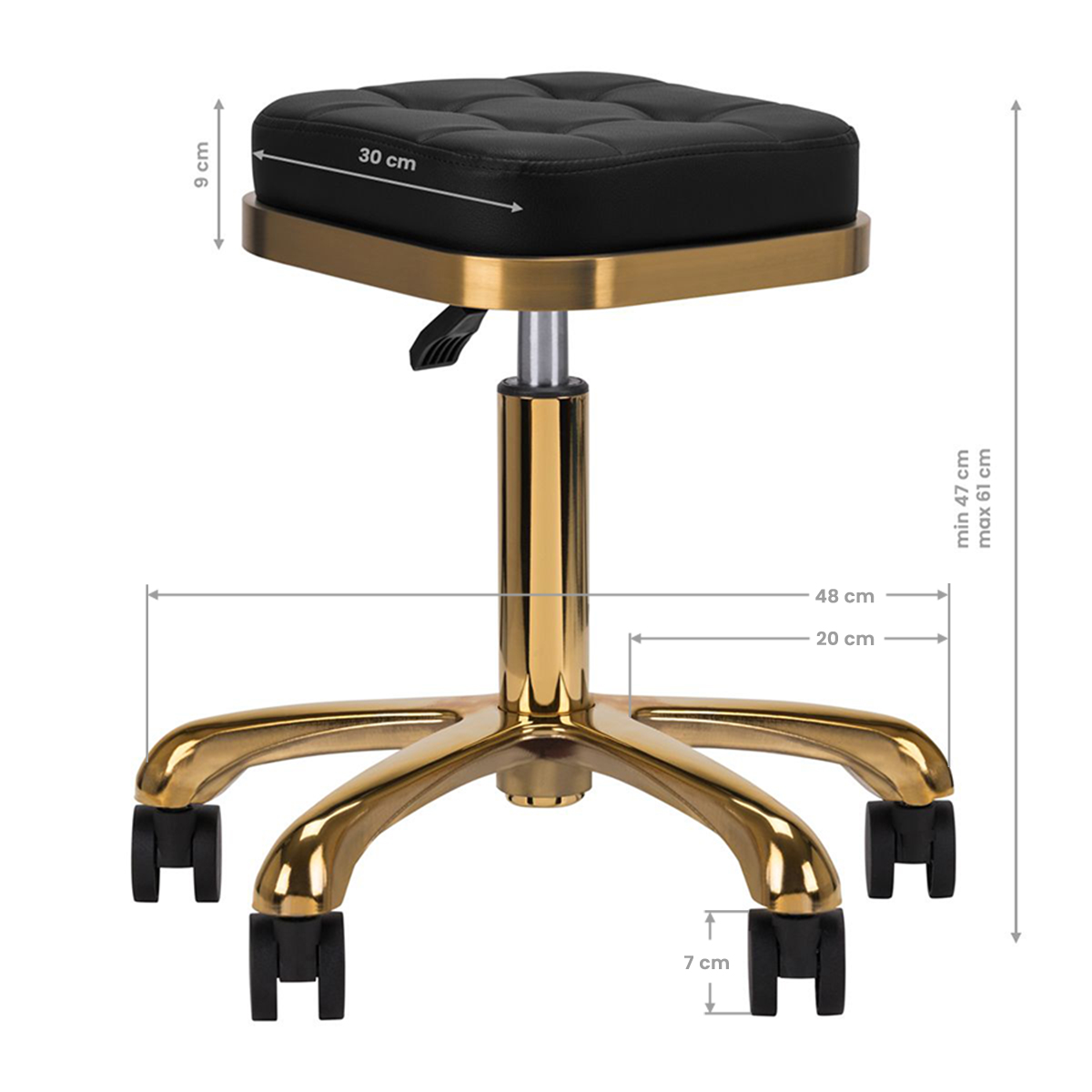 Das fünfarmige Fußkreuz gewährleistet Stabilität und Sicherheit auch bei häufigem Positionswechsel. Gummierte Rollen ermöglichen leichtes Bewegen im Salon. Die strapazierfähige Kunstlederpolsterung in Schwarztönen ist widerstandsfähig und leicht zu reinigen. Die dekorative Steppung verleiht dem Hocker Eleganz und unterstreicht seinen professionellen Charakter.Goldene Elemente sind lackiert. Mechanische Beschädigungen der Beschichtung unterliegen keiner Reklamation.Daten:Lift: GasliftHöhenverstellung: 50–63 cmPolsterfarbe: SchwarztöneSockelfarbe: GoldtöneRollenfarbe: Schwarztöne