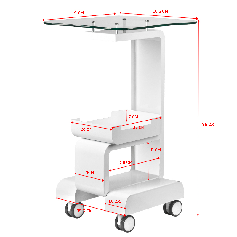 Die praktische Größe macht ihn zum idealen Helfer für Dauerwellen, Färbungen, Gesichtsbehandlungen und weitere kosmetische Anwendungen. Die stabilen Glasablagen sind leicht zu reinigen und hygienisch – perfekt für den professionellen Einsatz in der Kosmetikbranche.