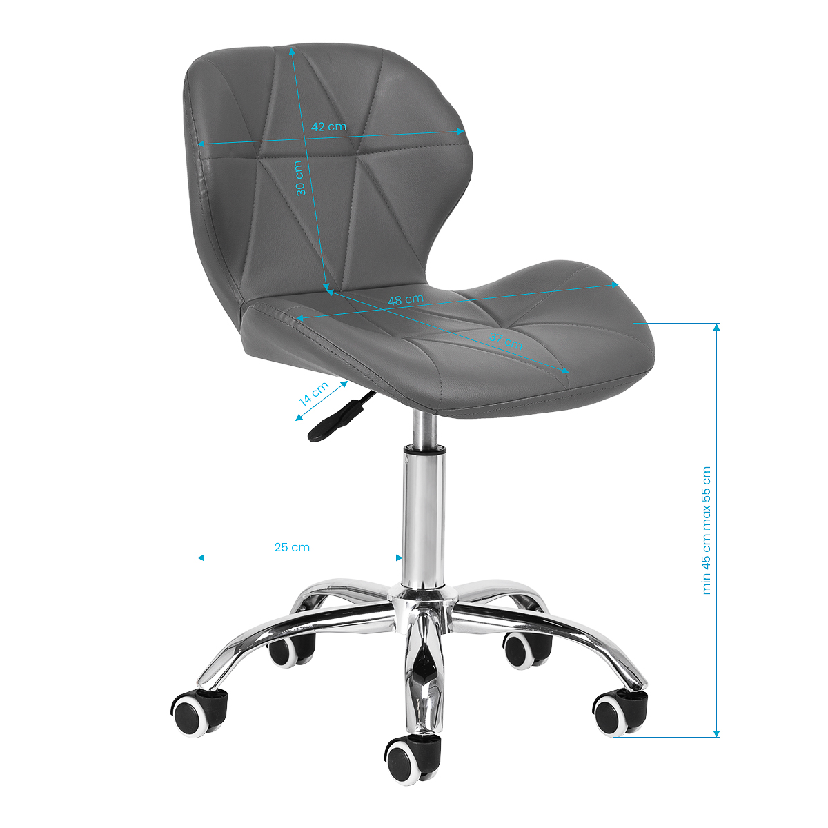 Der leistungsstarke Gasdruck-Zylinder ermöglicht eine präzise Sitzhöhenregulierung im Bereich von 42 bis 54 cm. Dies garantiert optimale Anpassung an unterschiedliche Körpergrößen und Arbeitsvorgänge – ob Makeup-Anwendung, Augenbrauenstyling oder andere kosmetische Tätigkeiten. Die 360-Grad-Drehfunktion steigert die Arbeitseffizienz und ermöglicht mühelose Positionswechsel während der Behandlung.