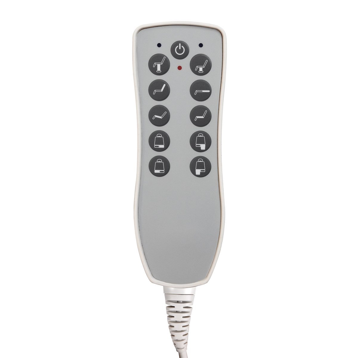 Die ergonomische Fernbedienung ermöglicht präzise Positionierung in fünf unabhängigen Achsen: Sitzhöhe, beide Fußstützen-Segmente und Wiege lassen sich individuell anpassen. Dieses Steuerungssystem ermöglicht flexible Anpassung an unterschiedliche Behandlungsarten – sowohl für optimalen Klientenkomfort als auch für rückenschonende Arbeitsergonomie des Behandlers. Die Fernbedienung lässt sich praktisch an den seitlichen Griffen befestigen für schnellen Zugriff während der Behandlung.