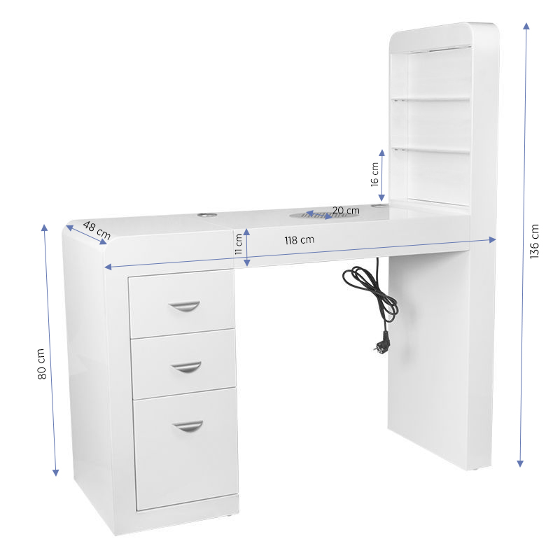 Der Kosmetikschreibtisch 310 weiß links ist ein hochfunktionelles Möbelstück, das speziell für professionelle Schönheitssalons und Nagelstudios entwickelt wurde. Er vereint drei wichtige Funktionen in einem eleganten Design: Arbeitsplatz, integrierte Staubabsaugung und Präsentationsregal für Nagellacke. Das moderne weiße Design harmoniert perfekt mit zeitgemäß eingerichteten Salon-Räumen und bietet dabei maximale Funktionalität.