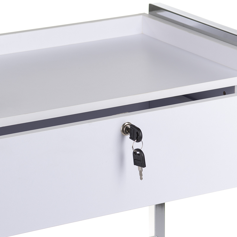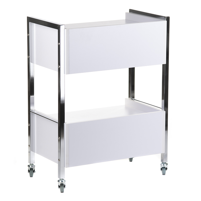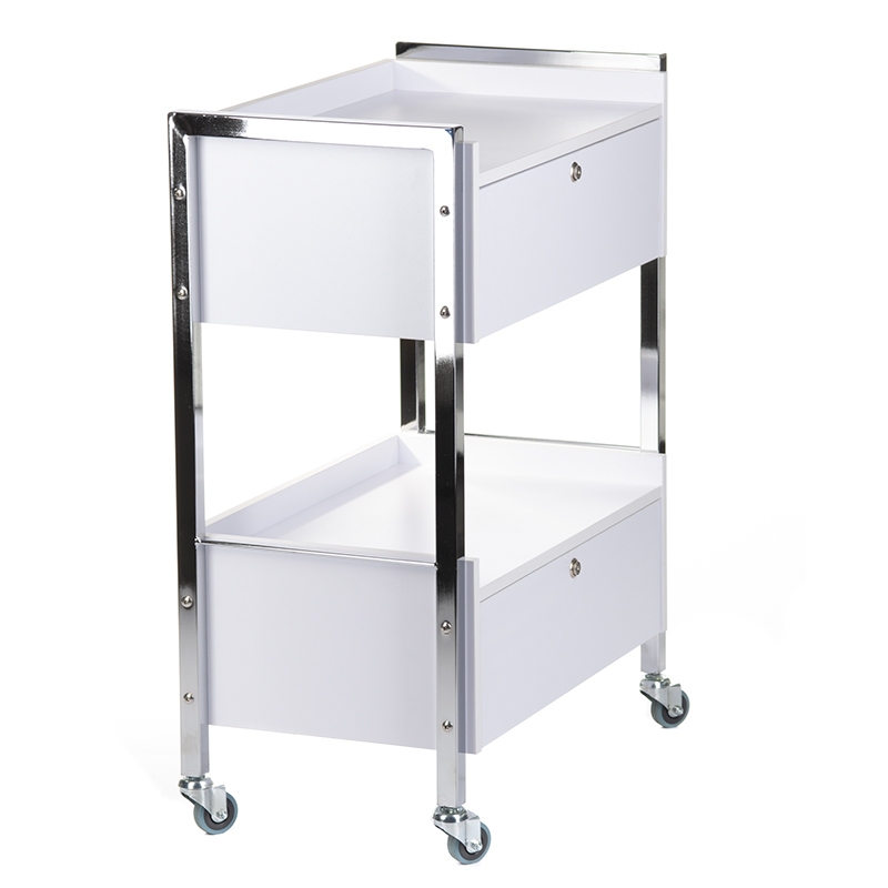 Der Kosmetikwagen Premium überzeugt durch seine durchdachte Funktionalität und hohe Mobilität. Die beiden integrierten Schubladen bieten ausreichend Stauraum für Werkzeuge, Pflegeprodukte und Zubehör. Dank der gummierten Rollen lässt sich der Wagen mühelos und geräuscharm zwischen den Arbeitsplätzen bewegen. Die großzügigen Ablageflächen ermöglichen eine systematische Organisation aller benötigten Utensilien. Als vielseitiger Schrank und Beistellwagen passt er sich flexibel an verschiedene Arbeitsabläufe an und erhöht die Effizienz im Salonbetrieb erheblich.