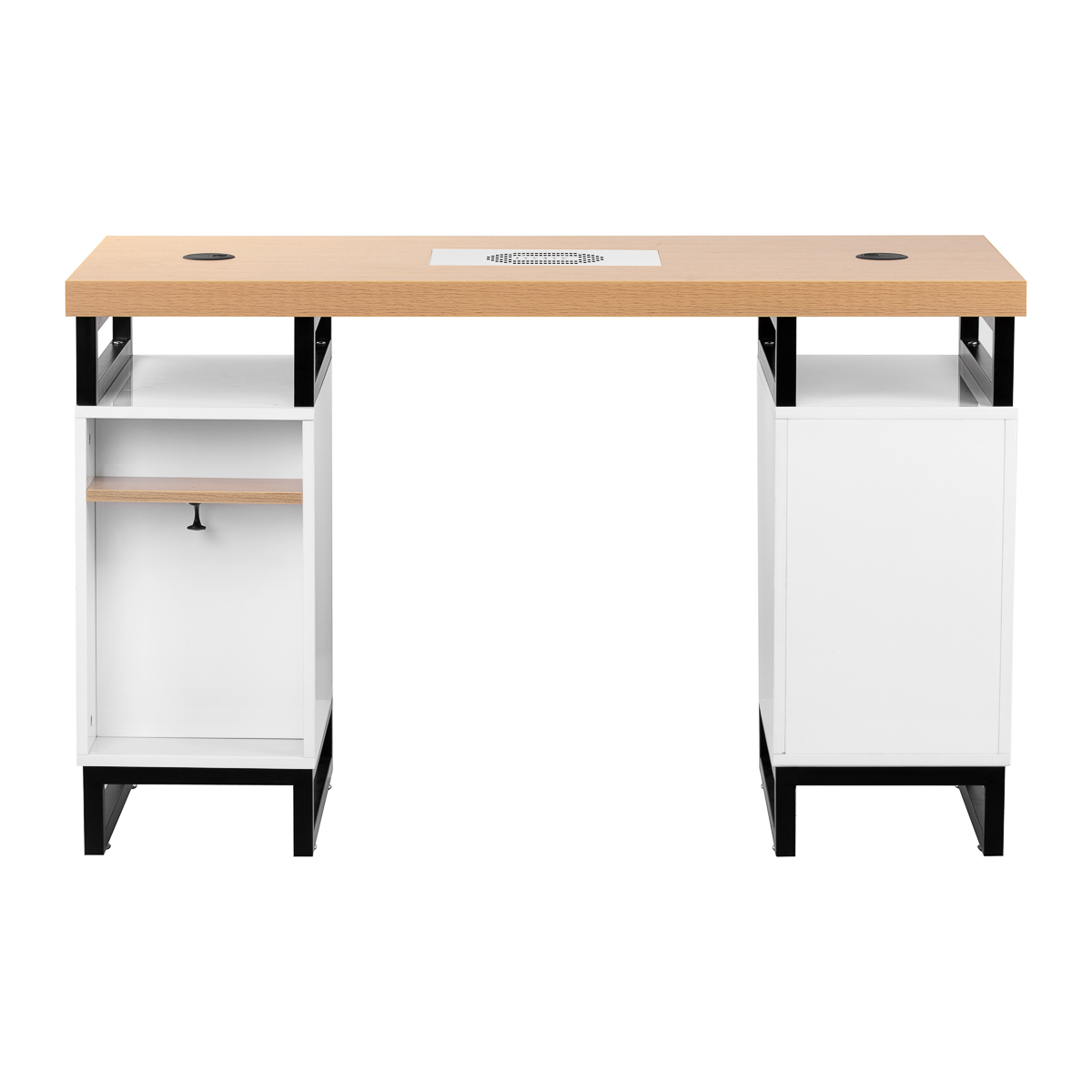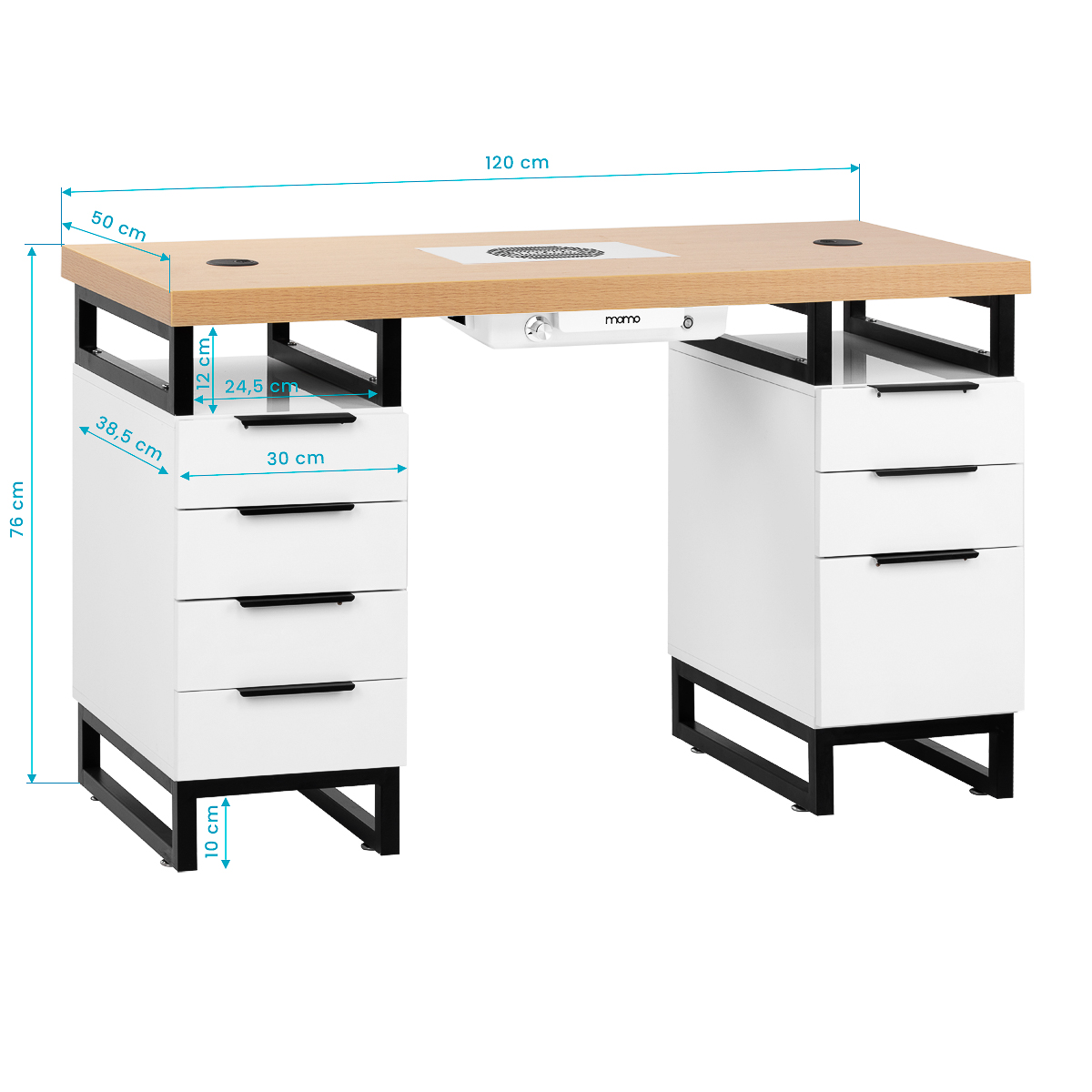 Der moderne Kosmetiktisch Momo L02 mit integriertem Staubabscheider vereint industriellen Stil mit maximaler Funktionalität für den professionellen Einsatz. Diese durchdachte Lösung wurde speziell für Nagelstudios und Kosmetikbereiche entwickelt, wo eine effektive Staubabsaugung essentiell ist. Die stabile Konstruktion und sorgfältig ausgewählten Materialien gewährleisten eine lange Lebensdauer bei intensiver Nutzung. Ideal für die tägliche Salonarbeit bietet dieser Arbeitsplatz optimale Ergonomie und Komfort.
