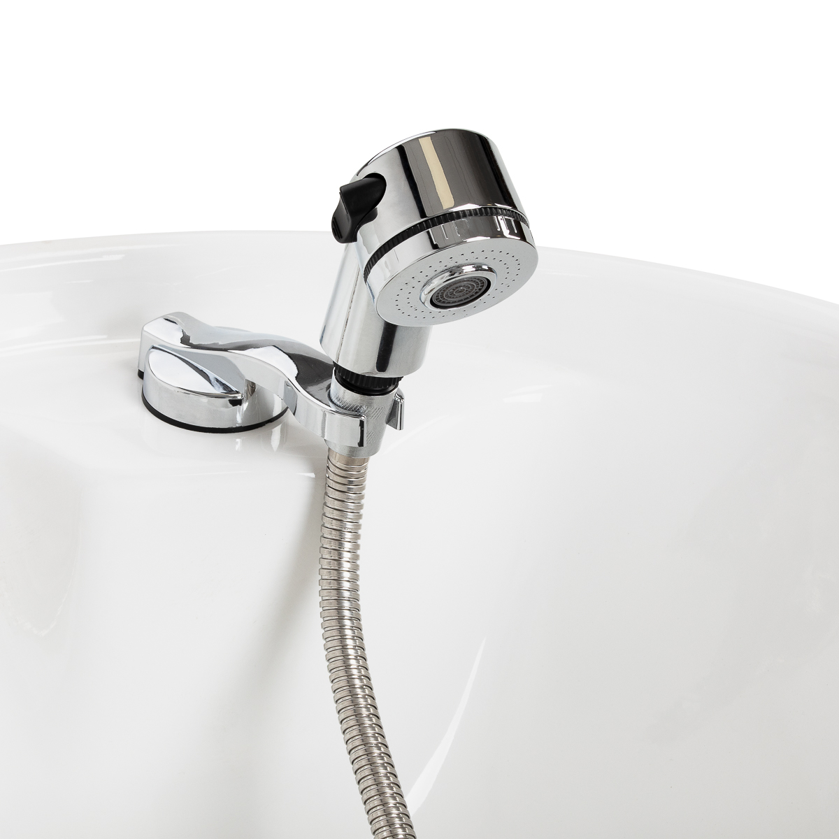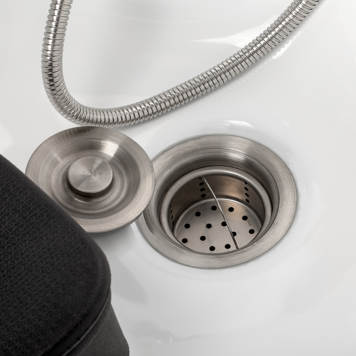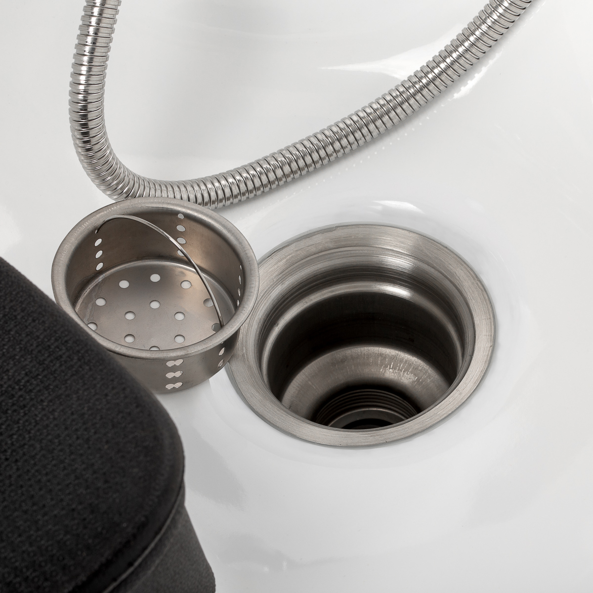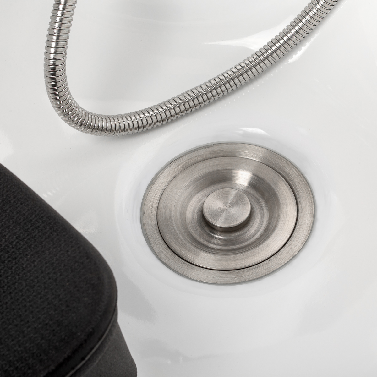 Das Modell ist mit einer Mischbatterie ausgestattet, die einen ständigen Zugang zu warmem und kaltem Wasser sowie eine bequeme Anpassung der Temperatur an die Bedürfnisse des Kunden gewährleistet. Eine Ablage für den Duschkopf sorgt für eine bessere Organisation des Arbeitsplatzes, und der Stopfen mit integriertem Sieb ermöglicht die Regulierung des Wasserflusses und trägt zur Hygiene am Arbeitsplatz bei. Der im Sockel versteckte Wasseranschluss ermöglicht eine ästhetische Verkleidung der Installation und unterstreicht das gepflegte und professionelle Erscheinungsbild der Waschstation. Funktionale Lösungen sorgen für einen reibungslosen und geordneten Arbeitsalltag im Salon.