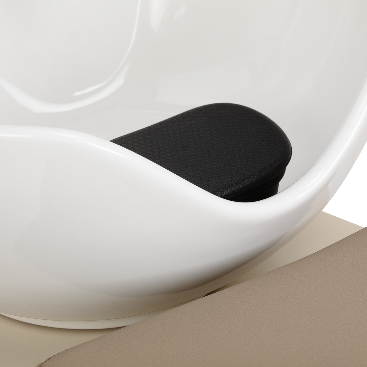 Die tiefe, abgerundete Keramikschüssel in Weißtönen begrenzt das Verspritzen von Wasser und Pflegeprodukten und trägt so zur Sauberkeit am Arbeitsplatz bei. Die langlebige Keramik zeichnet sich durch hohe Beständigkeit gegen Verfärbungen, Kratzer und chemische Einflüsse aus. Der geformte Rand sorgt für eine stabile Stütze des Kopfes des Kunden, und die praktische Stütze in der Waschschüssel ermöglicht eine bequeme Kopfhaltung. Eine Silikonauflage mindert das Kältegefühl und erhöht den Komfort des Kunden während der Behandlung.