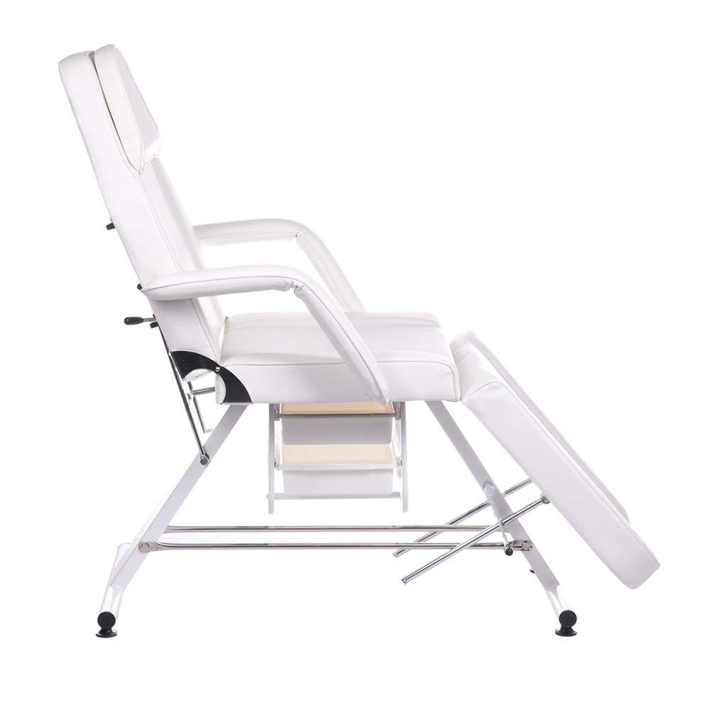 Die PediLux Pro Weiß ist eine professionelle Standard Kosmetikliege in elegantem Weiß, die speziell für Pediküre-Behandlungen entwickelt wurde. Diese hochwertige Kosmetikliege überzeugt durch ihre geteilten Fußteile, die eine individuelle Höhenverstellung beider Beine ermöglichen. Mit ihrer robusten Konstruktion und den praktischen Ausziehschubladen bietet sie optimale Arbeitsbedingungen für professionelle Kosmetikstudios. Die ergonomische Bauweise gewährleistet höchsten Komfort für Kunden und Behandler.