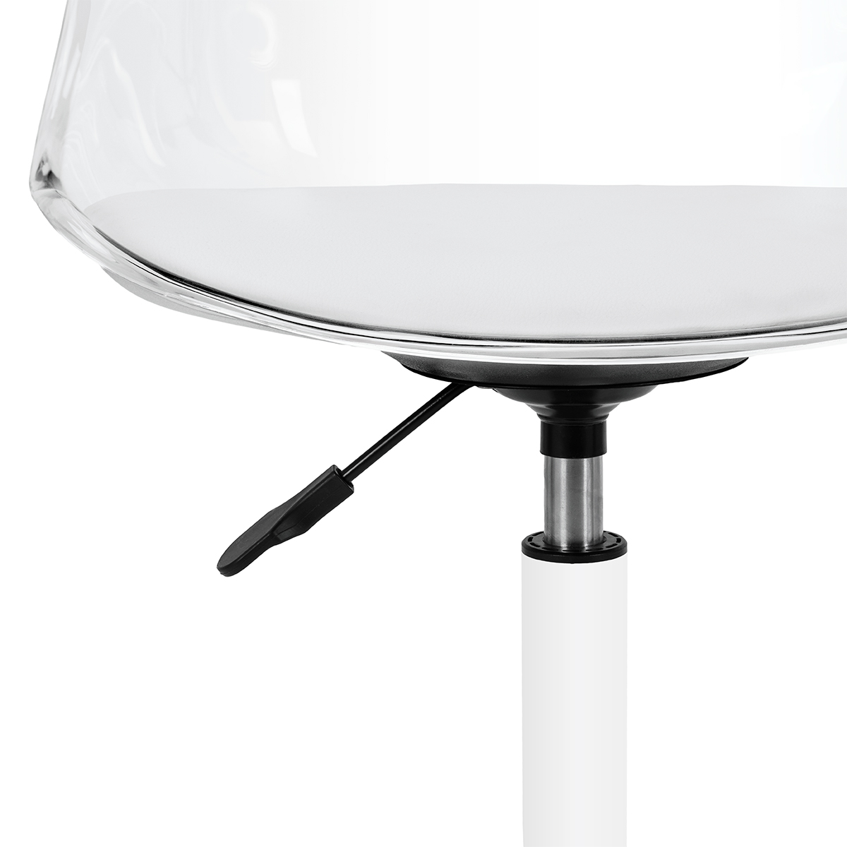 Mit seiner beeindruckenden transparenten Rückenlehne zieht dieser Stuhl bewundernde Blicke auf sich und vermittelt einen modernen, hochwertigen Eindruck. Die harmonische Kombination aus klarem Kunstglas mit weißem Kunstlederbezug, gepolstertem Sitzkissen und eleganter weißer Basis schafft einen anspruchsvollen visuellen Kon