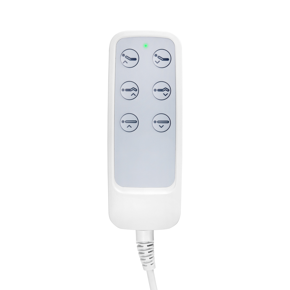 Der Stuhl wird über eine praktische kabelgebundene Fernbedienung gesteuert und ermöglicht stufenlose Einstellungen in drei Achsen. Höhe, Rückenlehne und Fußstütze lassen sich individuell anpassen – ideal für unterschiedliche Behandlungstypen. Ein spezieller Metallgriff an der Sitzseite ermöglicht sichere Aufbewahrung der Fernbedienung.