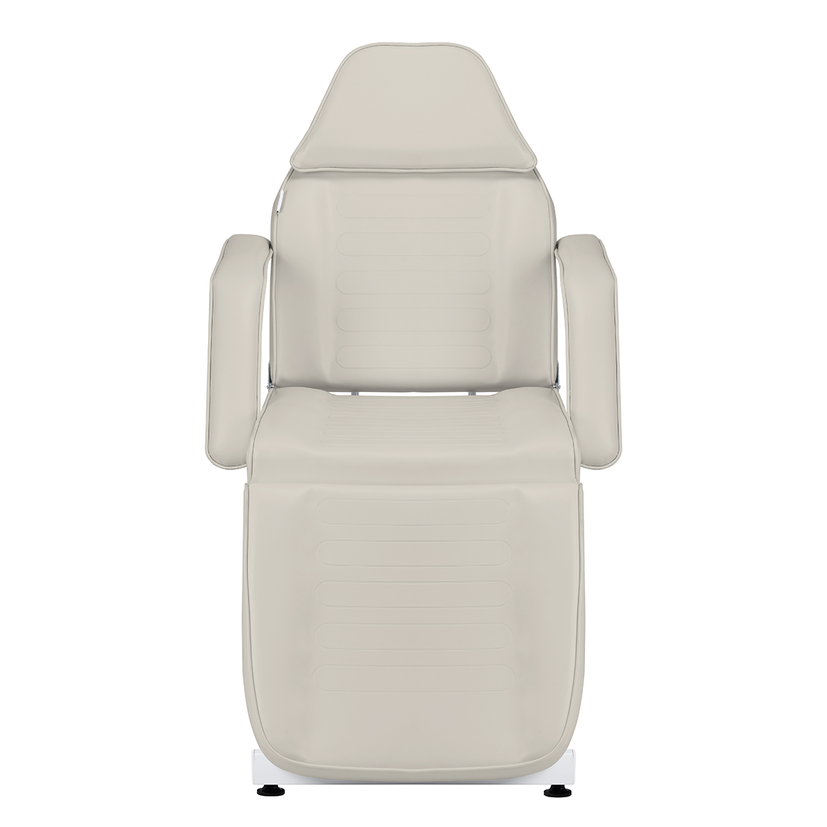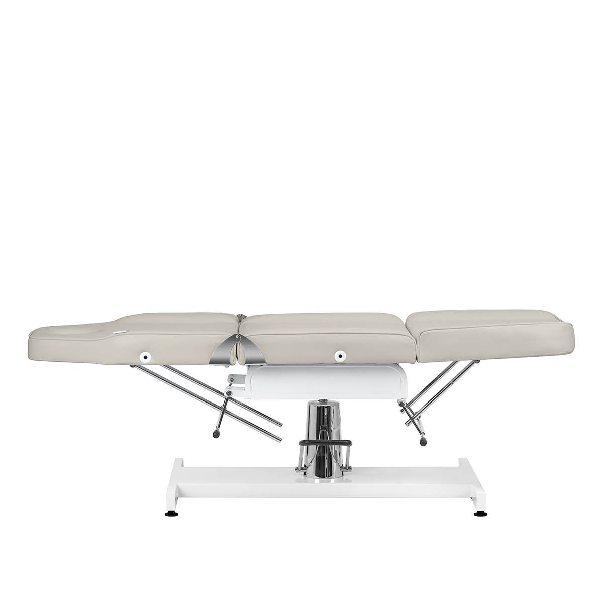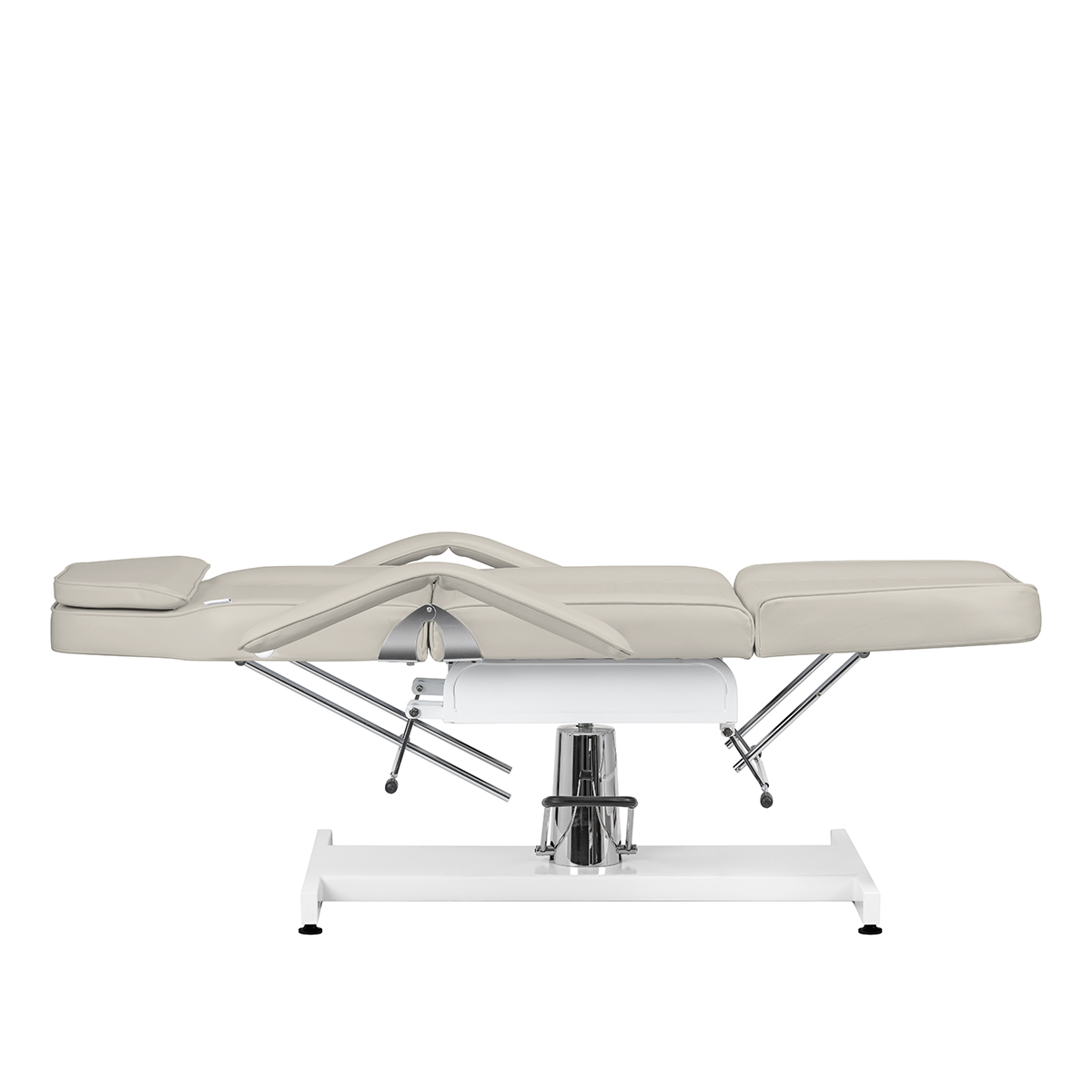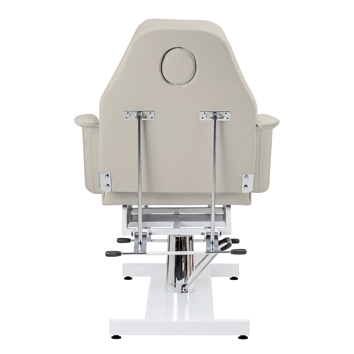 Spezielle Hebel ermöglichen die stufenlose Neigungsverstellung von Fußstütze und Rückenlehne. Dies garantiert optimale Anpassung an therapeutische Anforderungen und schafft maximalen Bedienkomfort. Der Stuhl lässt sich in eine vollständige Liegeposition transformieren und eignet sich daher hervorragend für Gesichts- und Körperbehandlungen aller Art.