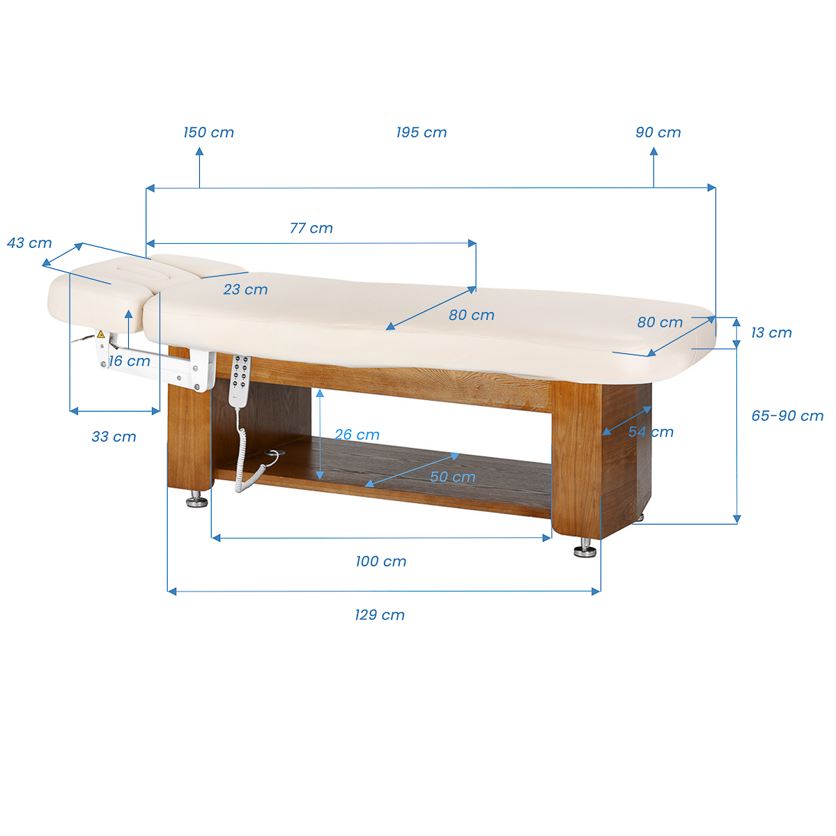 Mit der benutzerfreundlichen Fernbedienung verstellen Sie die Liege stufenlos in drei Ebenen: Arbeitshöhe, Rückenlehne und Fußbereich. Der Höhenverstellbereich von 65–90 cm passt sich ideal an Ihre Körpergröße und die jeweilige Behandlungsart an. Dies ermöglicht eine dauerhaft ergonomische Arbeitshaltung – unabhängig von Ihrer Körpergröße oder speziellen Anforderungen. Mit einem Knopfdruck lassen sich Rückenlehne und Fußstütze gleichzeitig verstellen, sodass Sie blitzschnell zwischen Sitz-, Halbliege- und Liegeposition wechseln können – ohne die Behandlung zu unterbrechen. Die stufenlose Verstellung fördert rückenschonende Arbeitstechniken und maximiert den Patientenkomfort in jeder Behandlungsphase.